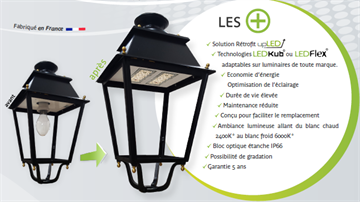 Offrant la possibilité de conserver les lanternes classiques (dites patrimoine) en adaptant un module Led étanche IP66, cette technologie est d'un avantage économique considérable par rapport au remplacement complet de la tête du luminaire.